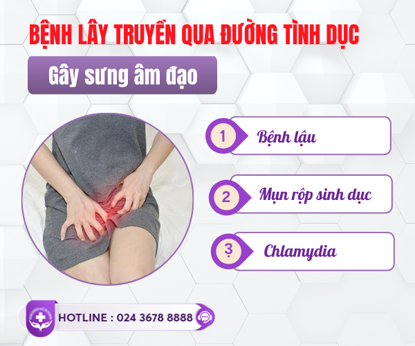Lậu: Sưng vùng kín, âm đạo tiết dịch mủ vàng xanh, đau khi giao hợp.