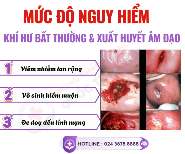 Khí hư ra nhiều, xuất huyết âm đạo bất thường là tín hiệu “sos” vùng kín đang cầu cứu bạn. Đừng chủ quan, đừng tự điều trị mà hãy nhanh chóng đến cơ sở y tế chuyên khoa để bác sĩ thăm khám, tìm ra nguyên nhân, có phác đồ điều trị phù hợp. →CLICK TƯ VẤN ONLINE! hoặc gọi tới Hotline 024.3678.8888 các chuyên gia y tế sẽ đồng hành cùng bạn từ A – Z trong hành trình khám, điều trị “Khí hư ra nhiều, xuất huyết âm đạo bất thường” nhanh chóng, an toàn, hiệu quả.