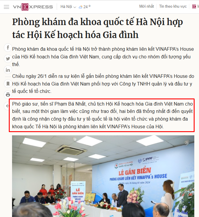 Báo Vnexpress: Phòng khám Đa khoa Quốc tế Hà Nội hợp tác Hội Kế hoạch hóa Gia đình